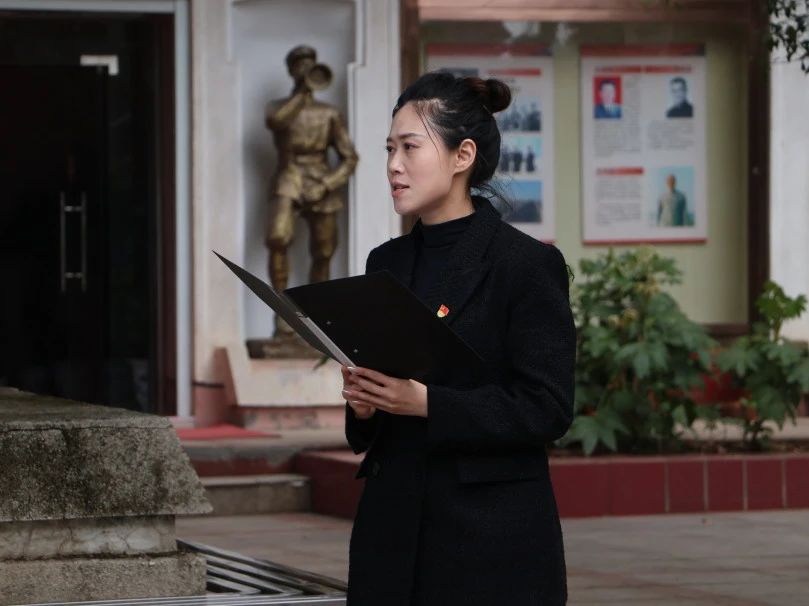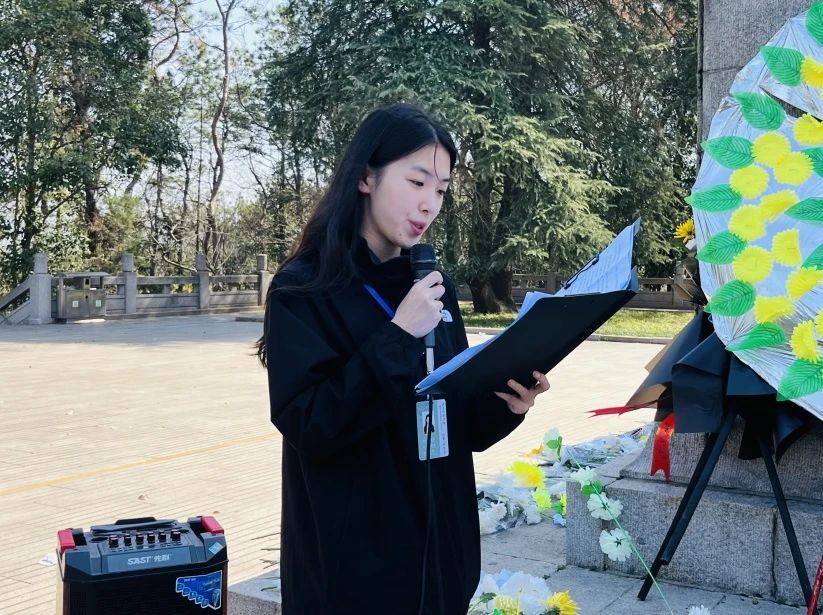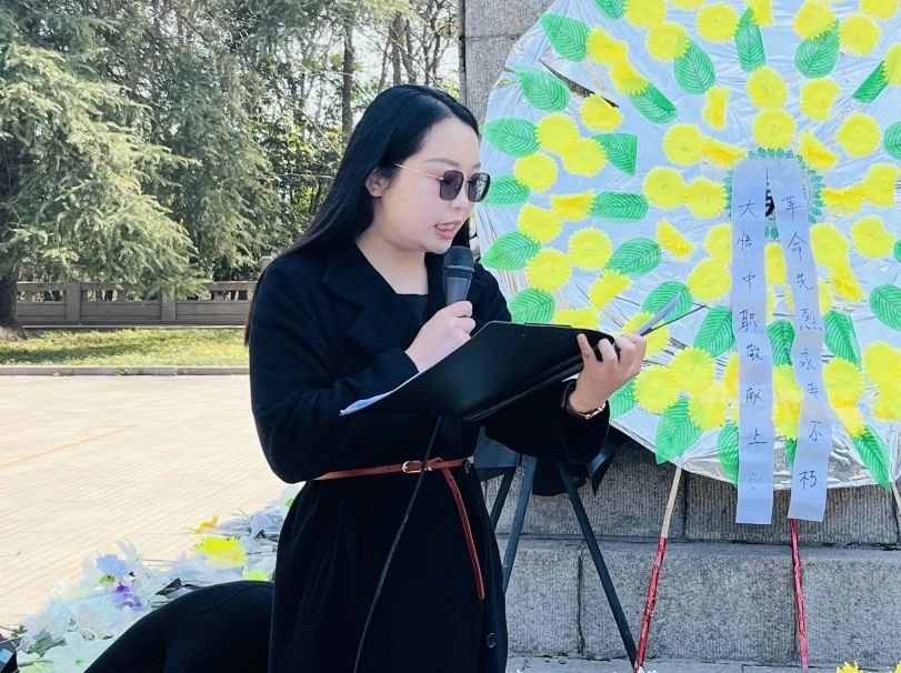 李思思老师和郭子兰老师作为教师代表分别发表讲话。李思思老师指出,正是因为先烈们的无私奉献和英勇奋斗,我们才得以享有今天的幸福生活与美好家园。因此,我院学子更应向烈士们致以最崇高的敬意,铭记他们的伟大功绩和不朽精神。郭子兰老师也表示,作为新时代青年要铭记革命先辈们的英勇事迹,明白今天的幸福生活来之不易,向他们致敬。