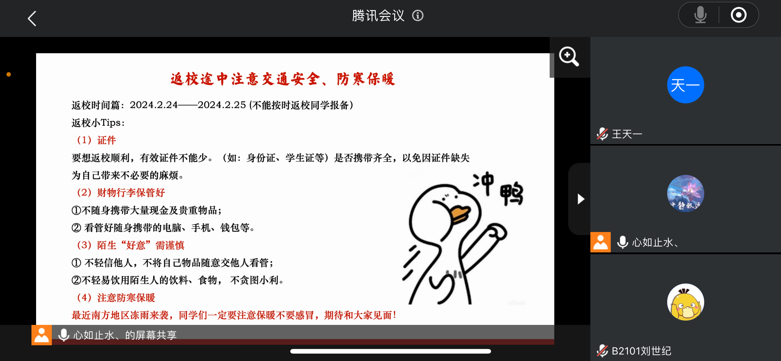 各位导员在会议上特别强调,因近期特殊天气原因,学生们返校需保护好自己的人身安全。