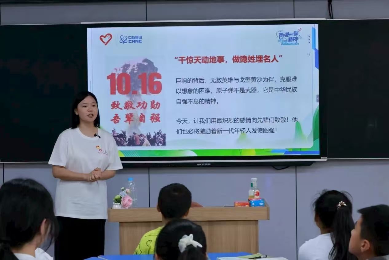 在宣讲现场,“赤韵播扬” 宣讲团播放了珍贵的历史影像,将我国第一颗原子弹爆炸的震撼画面呈现了出来,同学们直观见证科技奇迹。团队成员梳理核工业从筚路蓝缕到突破封锁的关键历程,聚焦 “干惊天动地事,做隐姓埋名人” 的奉献内核,讲述王淦昌隐姓埋名17年、郭永怀为护资料壮烈牺牲等故事,用科研先辈对祖国的赤诚、对事业的执着的精神,生动诠释了 “两弹一星” 精神的厚重底色,让红色基因在青少年心中扎根。