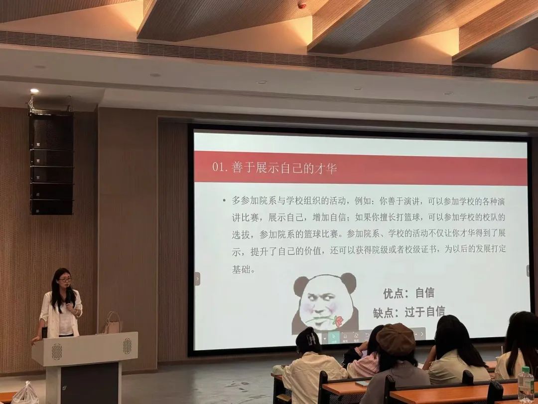 “自信”部分,老师鼓励同学们善于展示自己的才华,多参加院系与学校组织的活动,如演讲比赛、名师课堂等,以增加自信和提升自身价值。对于不太善于表达自己的同学,可以通过参加班干部竞选等方式克服短板,提升自信。此外,参加体育锻炼既能让身体更好,也能提升学习状态。