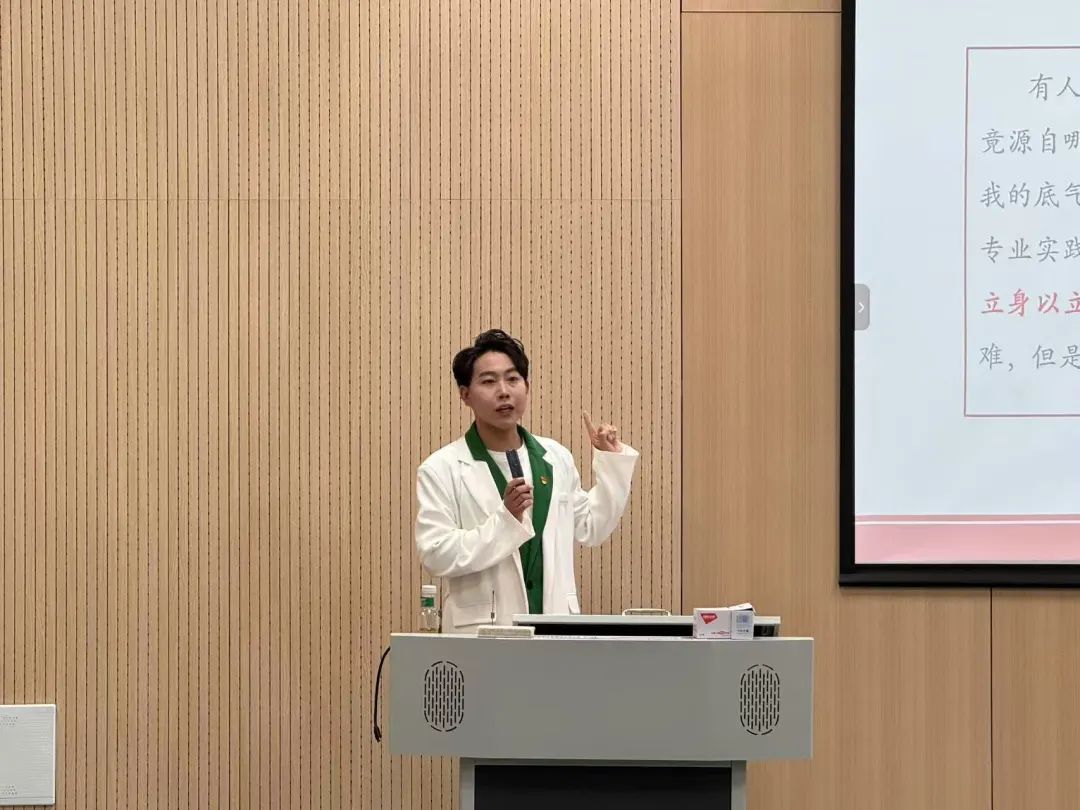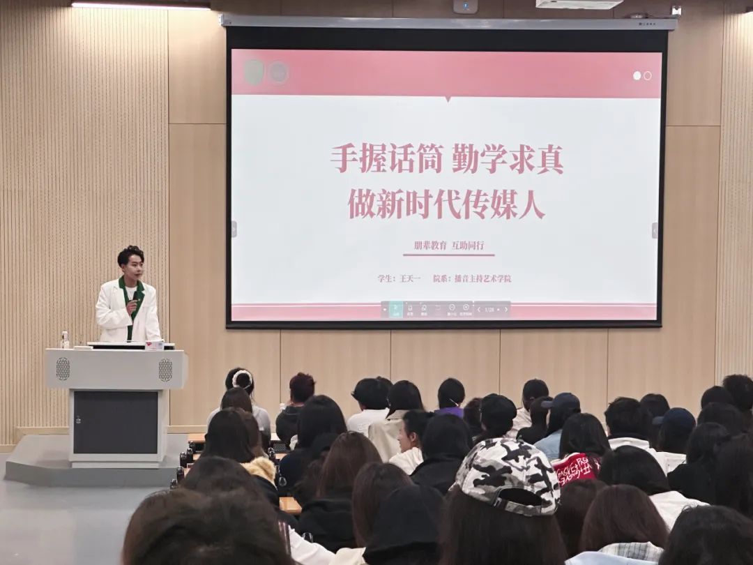 讲座期间,王天一同学以业精于勤、以赛促学、力学笃行为引领,讲述了自己自入学以来,始终秉持着勤奋刻苦的态度对待专业学习。无论是日常的课程学习,还是课后的自我提升,他都一丝不苟。每天清晨,他都会早起进行发声练习,不断打磨自己的基本功,力求让每一个字音都清晰、准确、富有感染力。在专业课程上,他积极与老师互动,认真记录每一个知识点,课后及时复习巩固,遇到不懂的问题,主动向老师和同学请教,直到完全理解为止。同时,他还广泛涉猎各类与传媒相关的书籍、影视作品等,拓宽自己的知识面和视野,为专业能力的提升打下坚实的基础。
