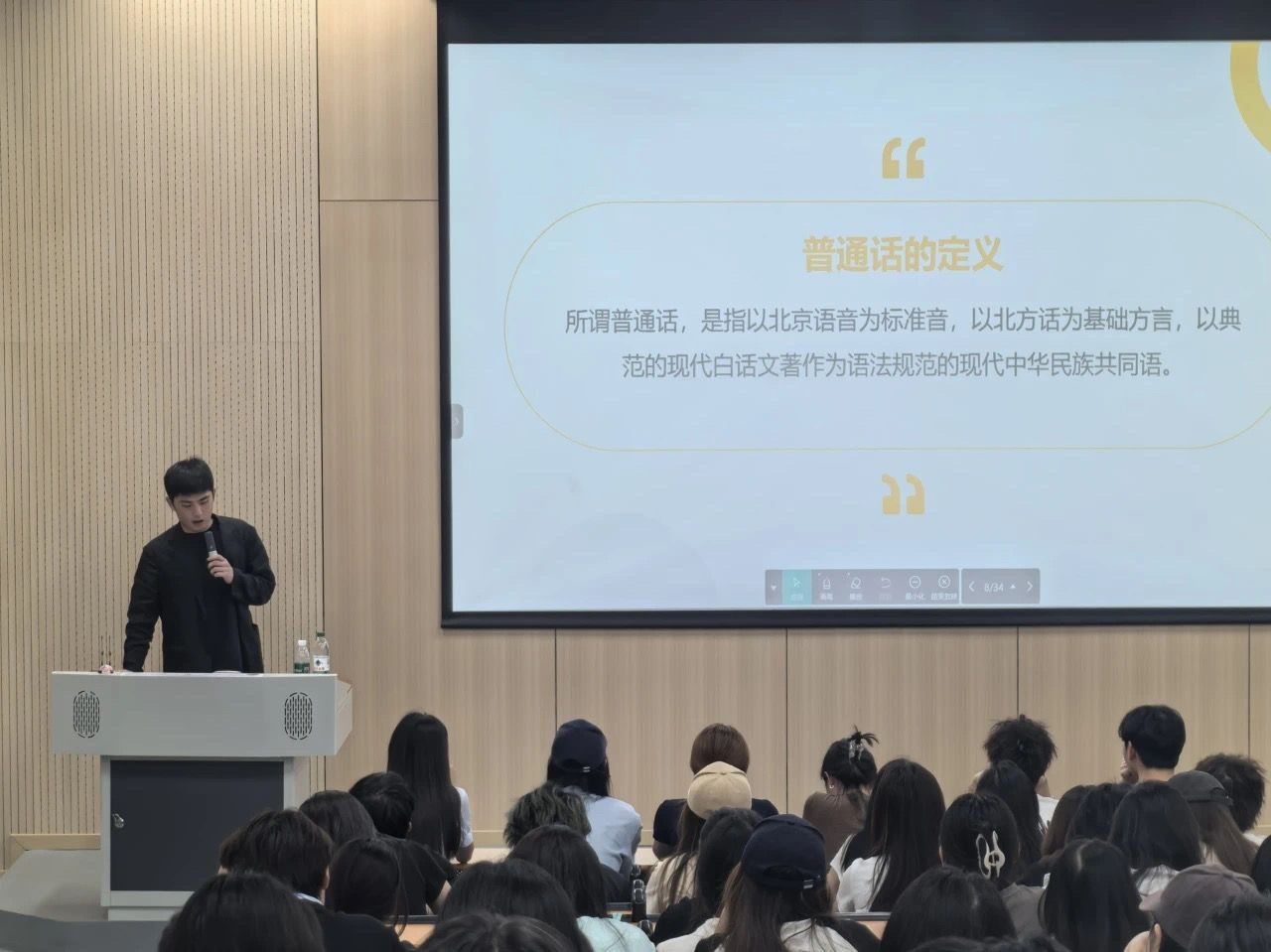 在此期间,同学们积极参与互动,采用理论讲解与实践示范相结合的方式,针对普通话发音难点展开专项训练。从平翘舌音的精准区分,到声调调值的细腻把控,再到儿化音、轻声的自然运用,同学们踊跃参与到模拟练习、跟读训练之中,对普通话的理解从理论认知转化为实操感悟。