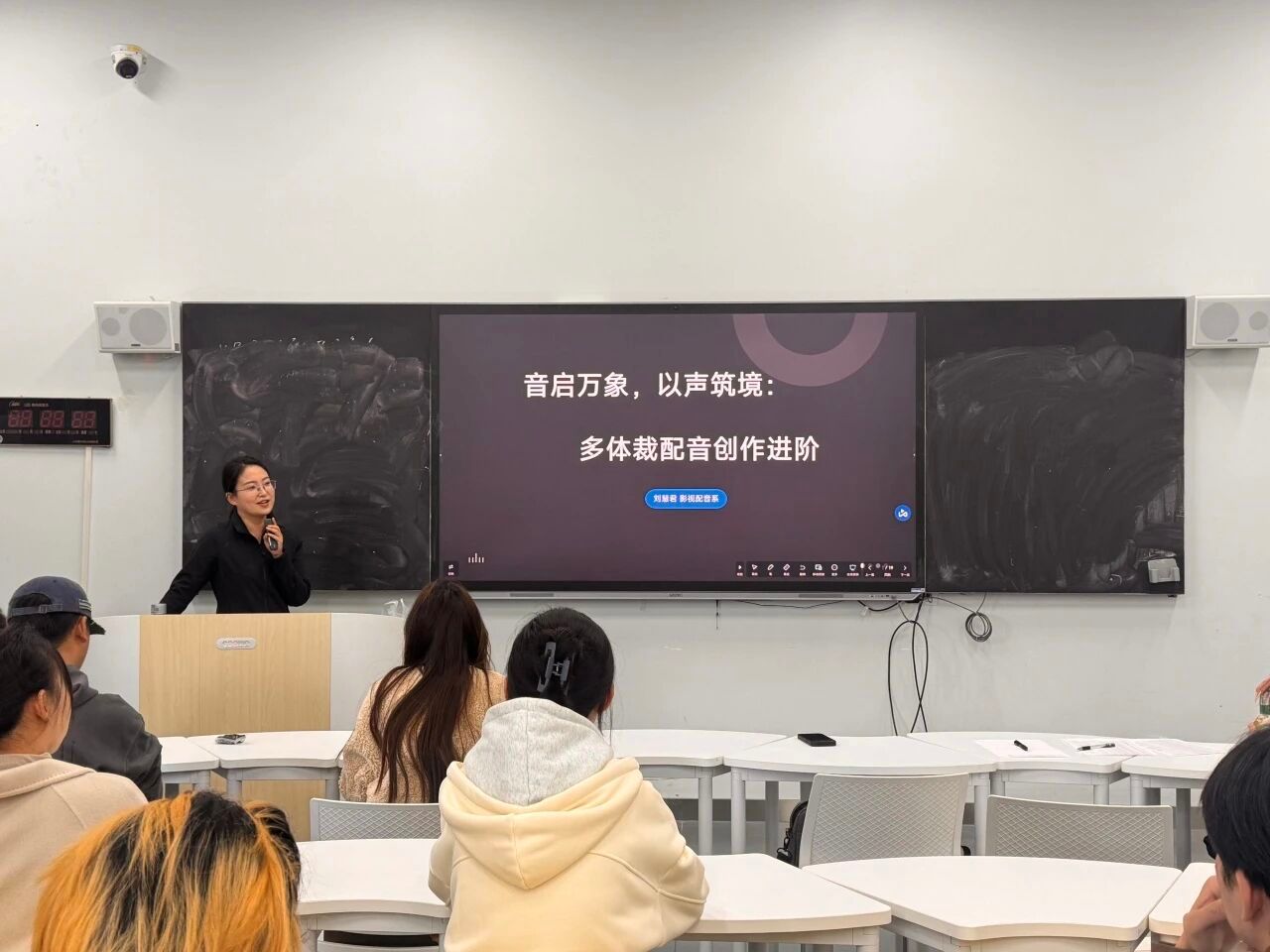 在授课过程中,刘慧君老师从气息控制、发声技巧等基础内容入手,深入讲解了声音演绎的方法,帮助同学们运用声音塑造人物性格、传递核心情感。刘老师还强调,同学们应在实际练习中将理论知识转化为生动而富有感染力的艺术表达。