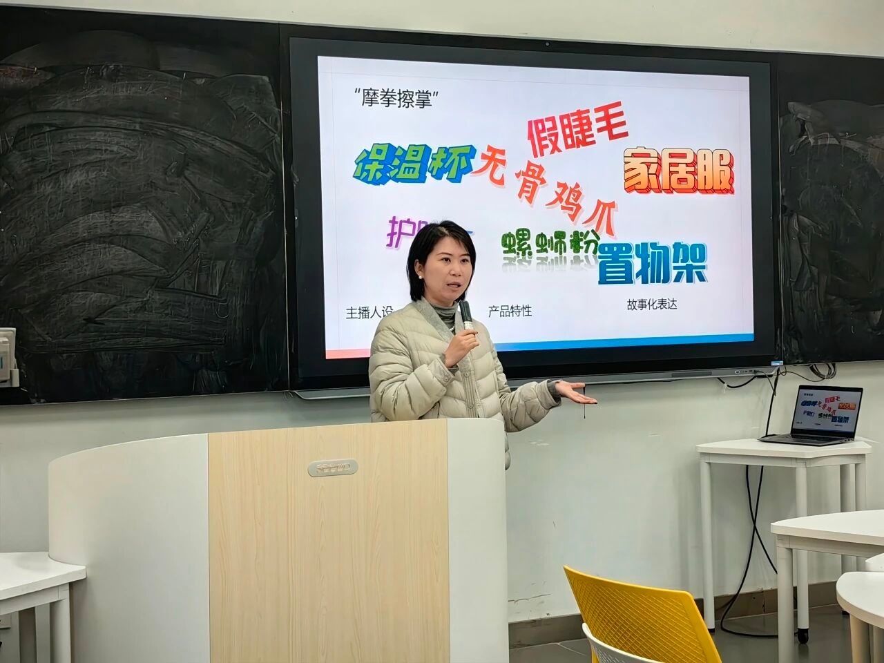 在授课过程中,张倩老师以大广赛营销创客类网络直播赛道为例,围绕该赛道的赛事规则、直播内容要求、话术表达技巧三大核心模块展开讲解。张倩老师首先拆解了直播赛道的赛段设置、作品要求,随后细化直播间搭建、主播定位等实操要点,最后结合案例分享了“总-分-总”节奏把控、画面感语言塑造等带货话术技巧。此外,张倩老师还强调“赛事是练兵场,要在规则内用专业表达放大内容感染力”。她用“置物架”做了讲解示范,并鼓励同学们把课上所学习的技巧运用到实际比赛中去。