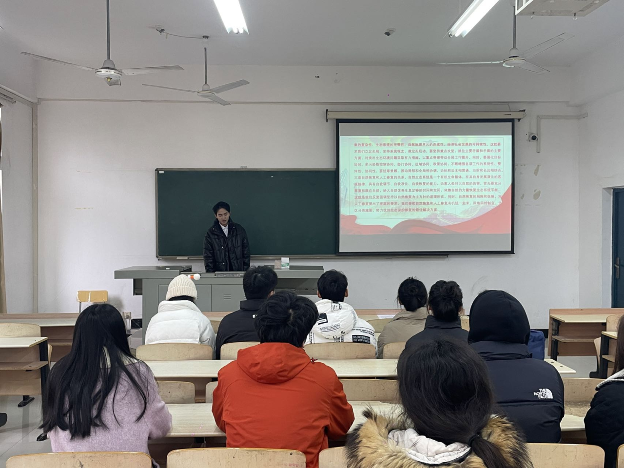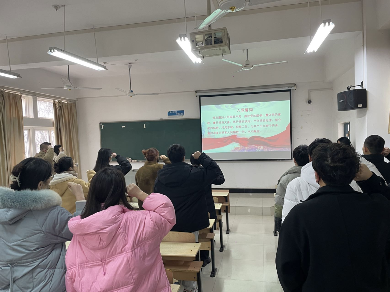会议伊始,全体起立,唱国歌,学生各党支部书记带领全体党员同志重温入党誓词。