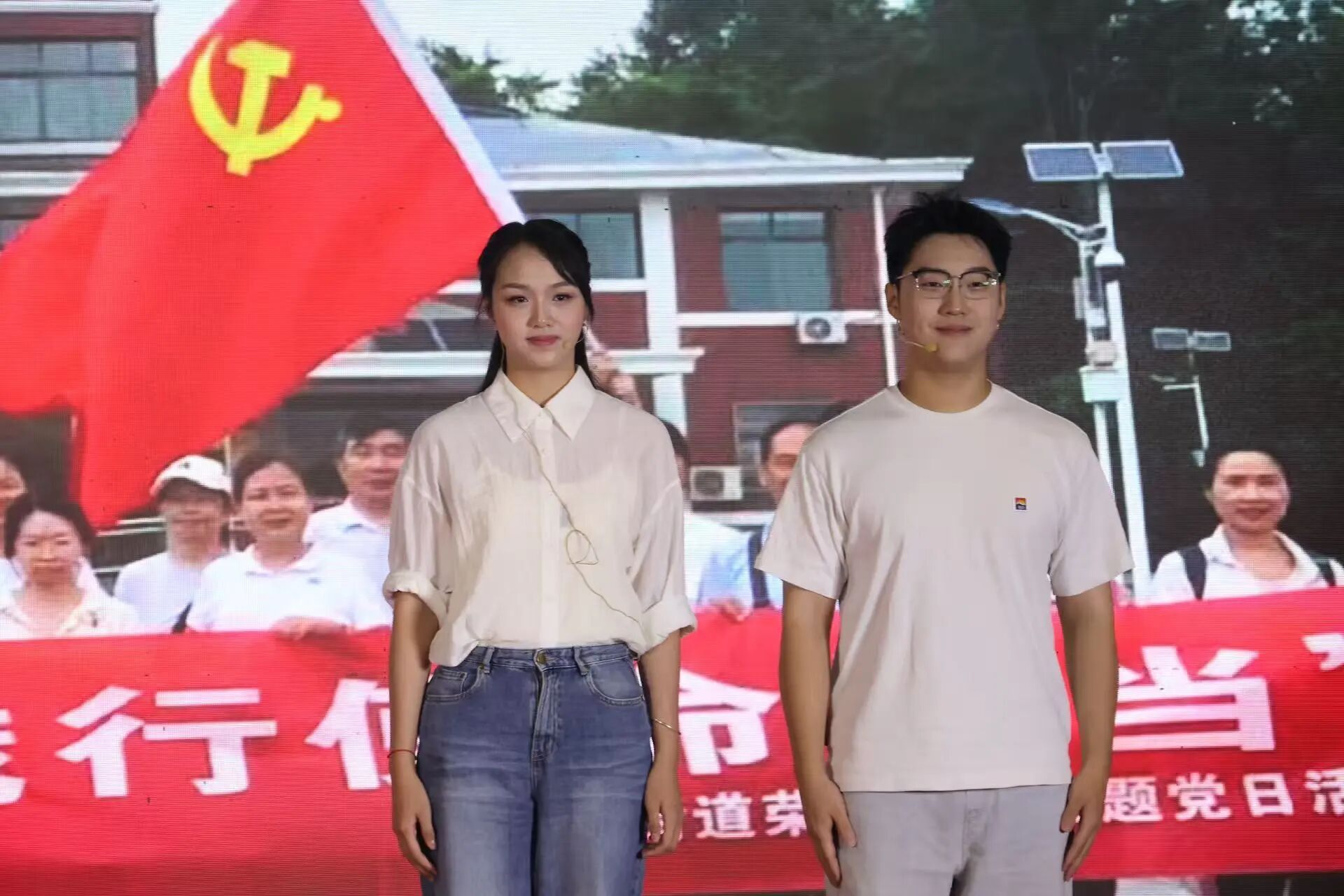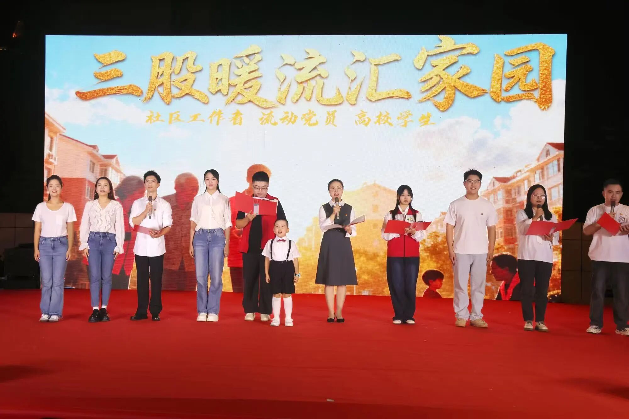 “我的祖国,可爱的祖国…”。汇演现场,我院23级播音与主持艺术专业学生代表杨思宇、黄嘉琪、廖瑞琪、乐明鑫与社区工作者、社区流动党员同台,倾情朗诵《三股暖流汇家园》。表演者们用声音传递力量,观众们用眼神回应温度,让在场的每一个人都清晰地感受到家园的温暖。