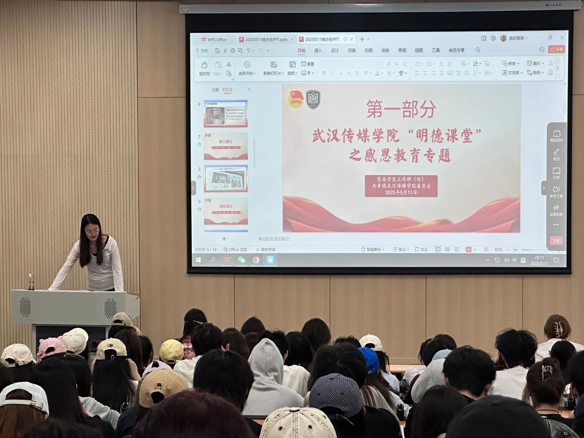 在主题教育中,辅导员通过组织开展感恩故事分享、观看专题影像等多元形式,引导同学们深刻体悟感恩内涵,激发情感共振,有效增强了集体凝聚力。辅导员老师们特别选取的视频资料,通过真实鲜活的生活场景呈现,令在场的同学深受触动。生动的影像叙事不仅深化了同学们对感恩精神的认知,更激发了情感认同与价值共鸣。同学们纷纷表示,将把感恩情怀转化为具体行动,通过志愿服务、暖心互助等形式践行社会责任。
