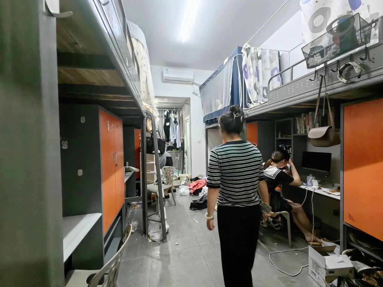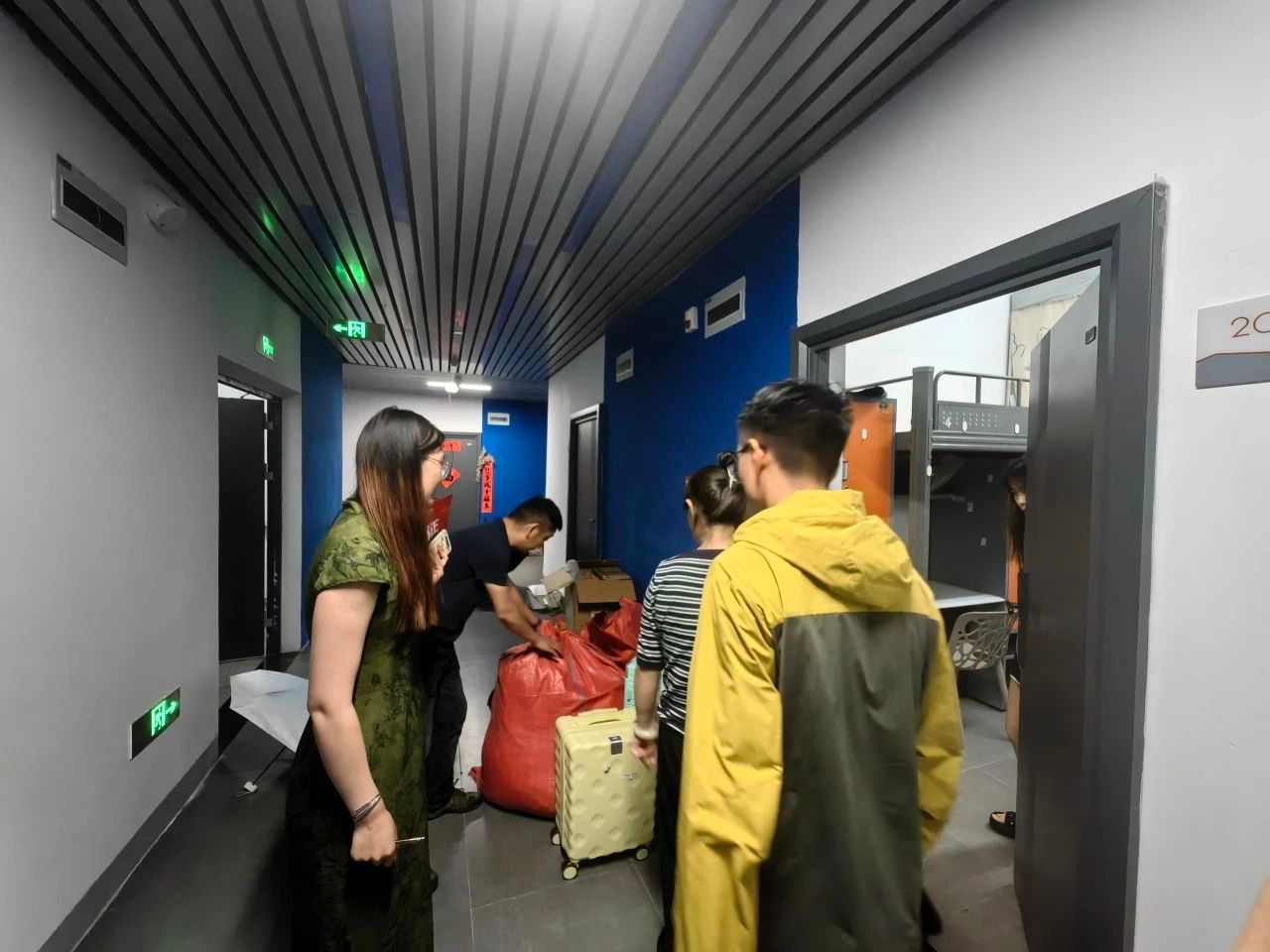 会议结束后,费燕琴老师和董金金老师前往同学们的宿舍楼,查看同学们的行李打包进度。董老师嘱咐同学们:“被子衣物一定要用防水袋或大塑料袋多包几层,大雨天气千万要做好防水措施。”