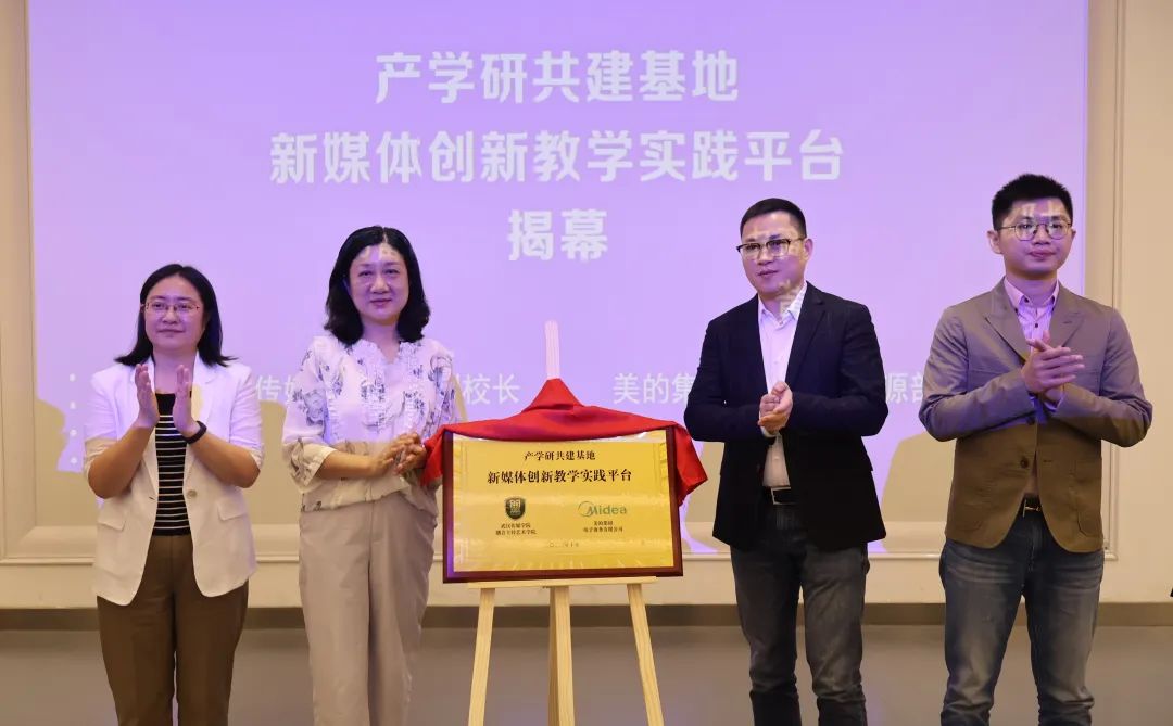 仪式伊始,姜虹老师与顾龙部长进行开场致辞,并在致辞结束后与宗微老师共同为校企共建新媒体创新教学实践平台揭幕。