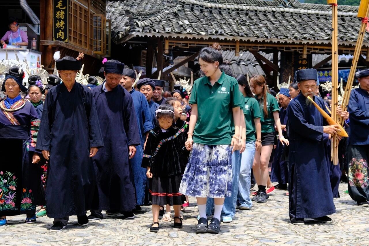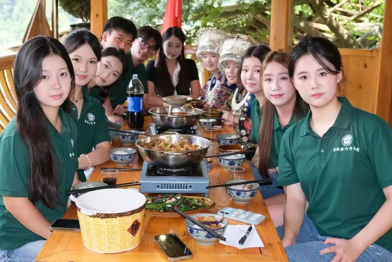 此外团队还走进了凯里朗德上寨,与当地苗族村民进行亲切互动。体验拦门酒、观看歌舞表演、感受当地习俗 “长桌宴” 与 “高山流水” 的独特魅力,成员们发现,普通话的使用在这里搭建起了便捷沟通的桥梁。村民们借助普通话,能够清晰地向外界介绍苗族特色手工艺品背后的故事与寓意,游客们也因此能更深入地了解当地文化,增进对苗寨风情的喜爱。