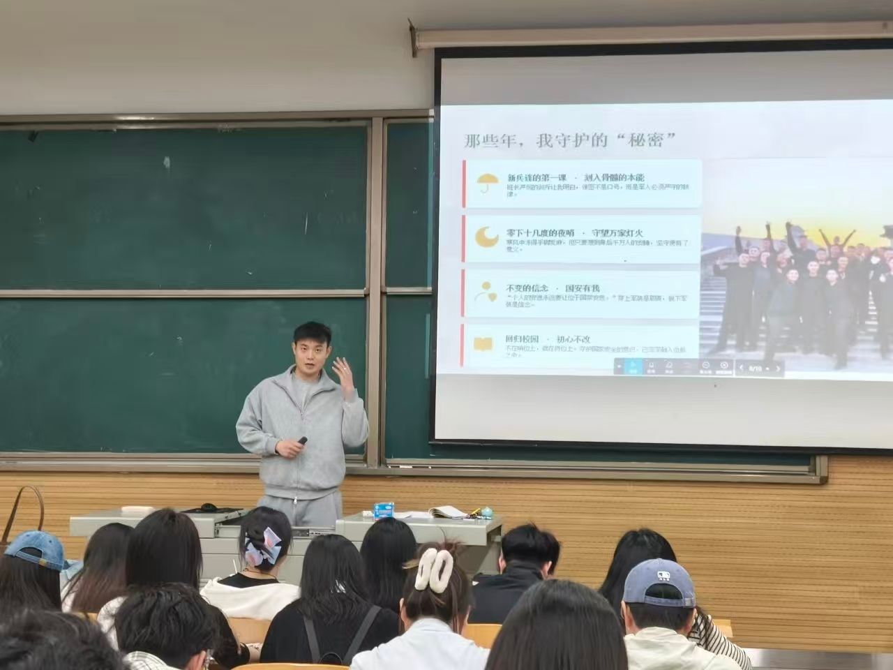 此外,本次活动还特别邀请了退役士兵芮一琦同学担任分享嘉宾。芮一琦同学曾在部队服役两年,亲身驻守国家安全的“第一道防线”。如今虽脱下军装回归校园,但他守护家国的责任未曾消减,安全意识也始终牢固。他结合自身军旅生涯,为同学们带来了课本上学不到的国家安全知识,用鲜活的军旅经历诠释了“青春挺膺,护国安邦”的担当,让大家对国家安全有了更真切的感受、更深刻的体悟。